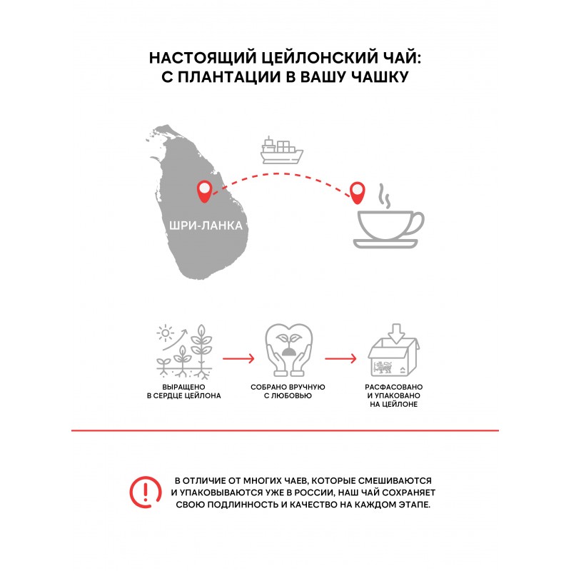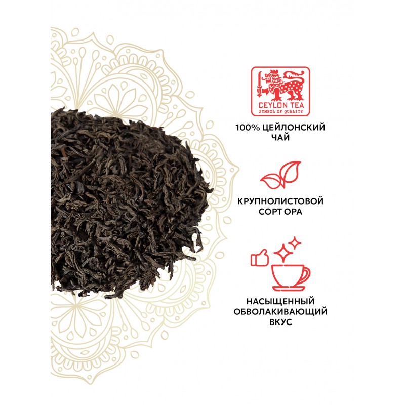 100% цейлонский крупнолистовой черный чай (ОР).Отборный чайный лист с плантации РУХУНА, расположенной в южной части острова Цейлон. Чай характеризуется нежным вкусом и ароматом.